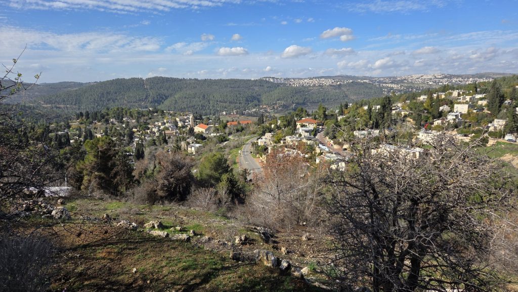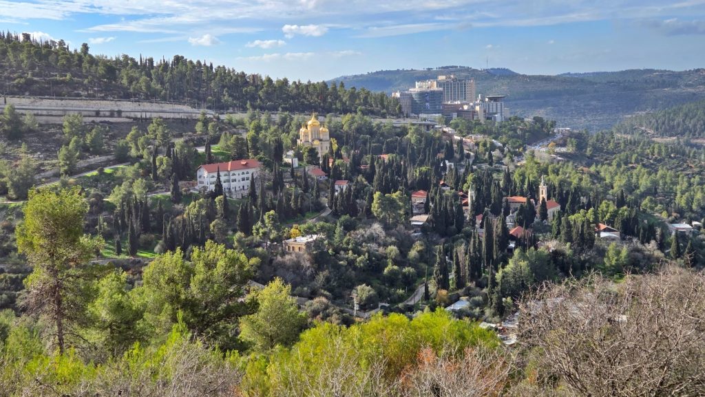 At the top — a view toward the churches, and Hadassah Ein Kerem Hospital in the distance.