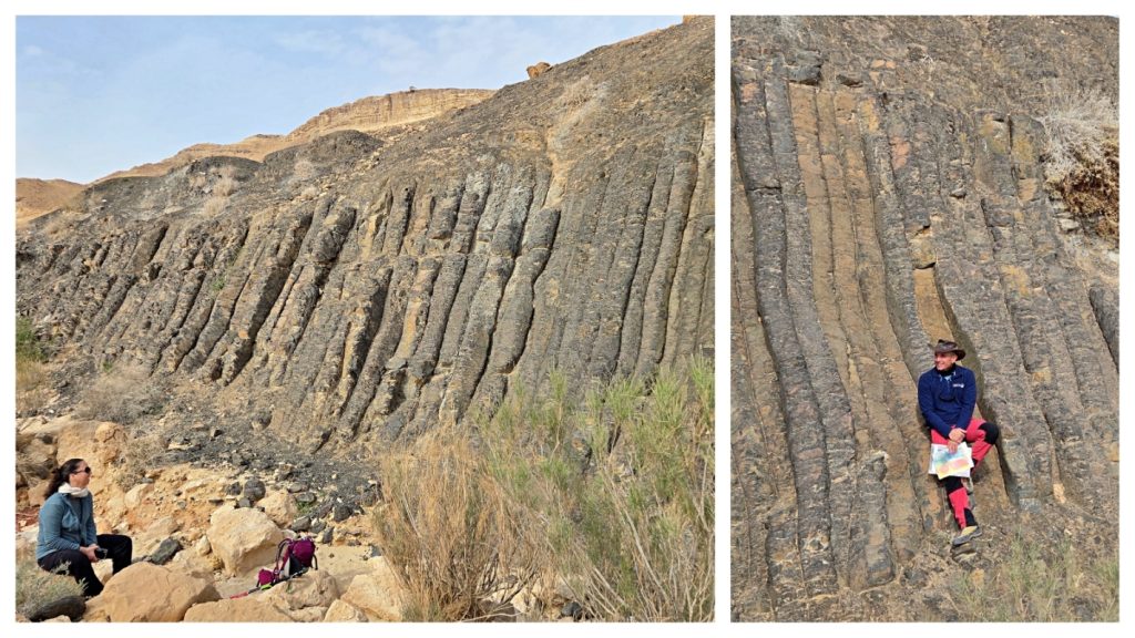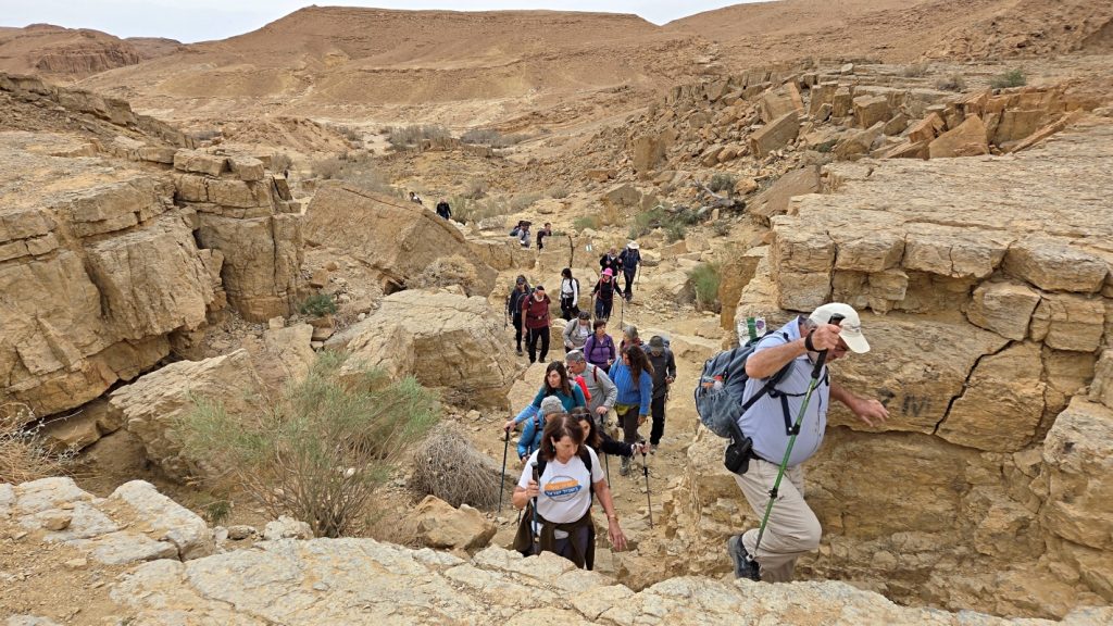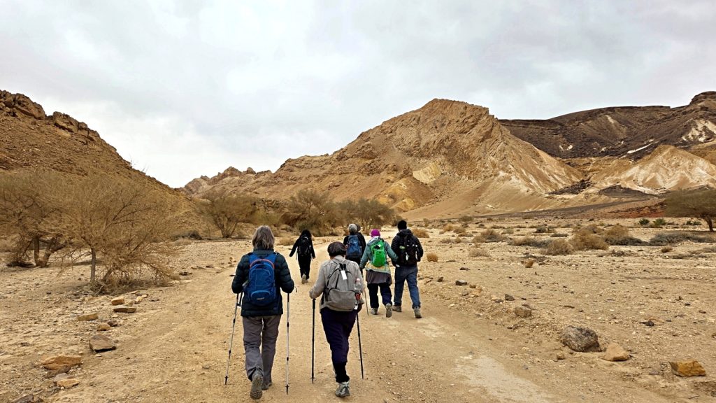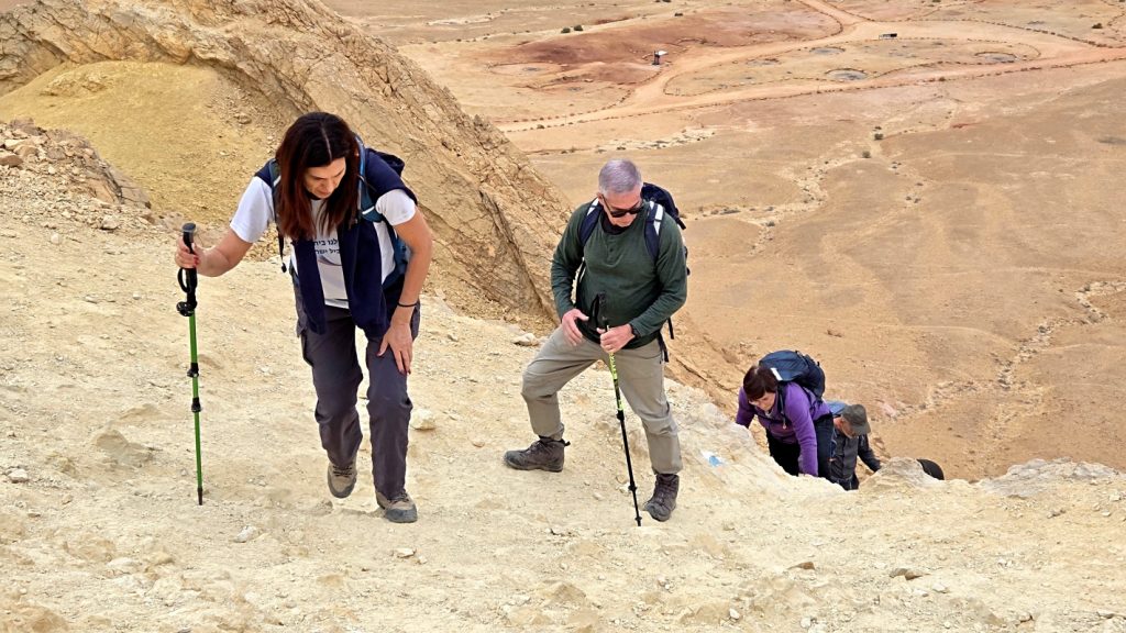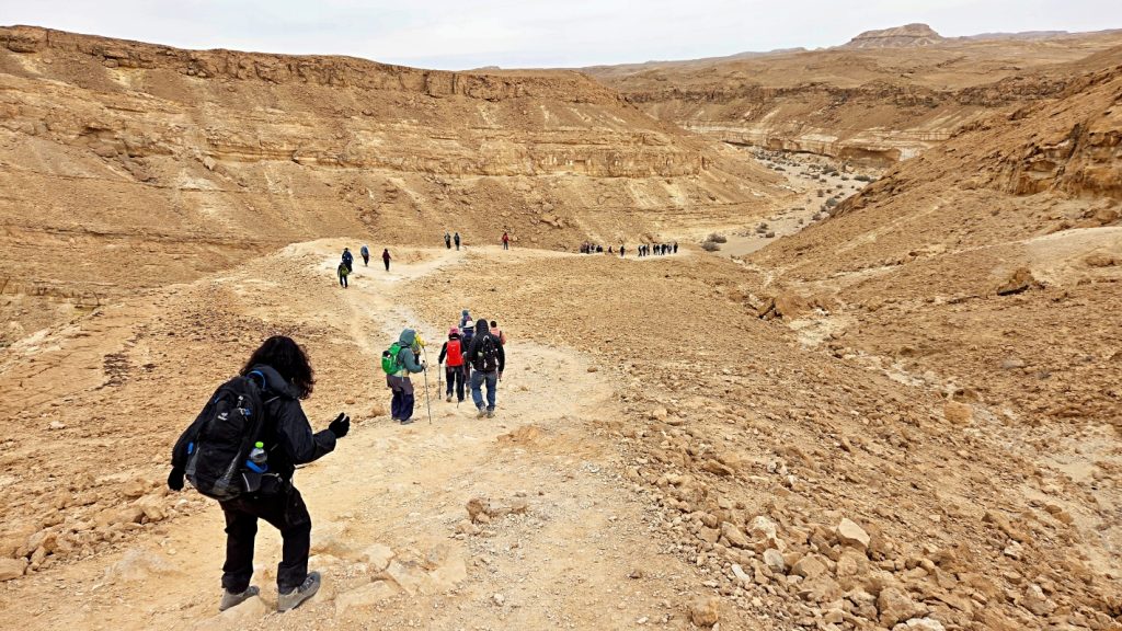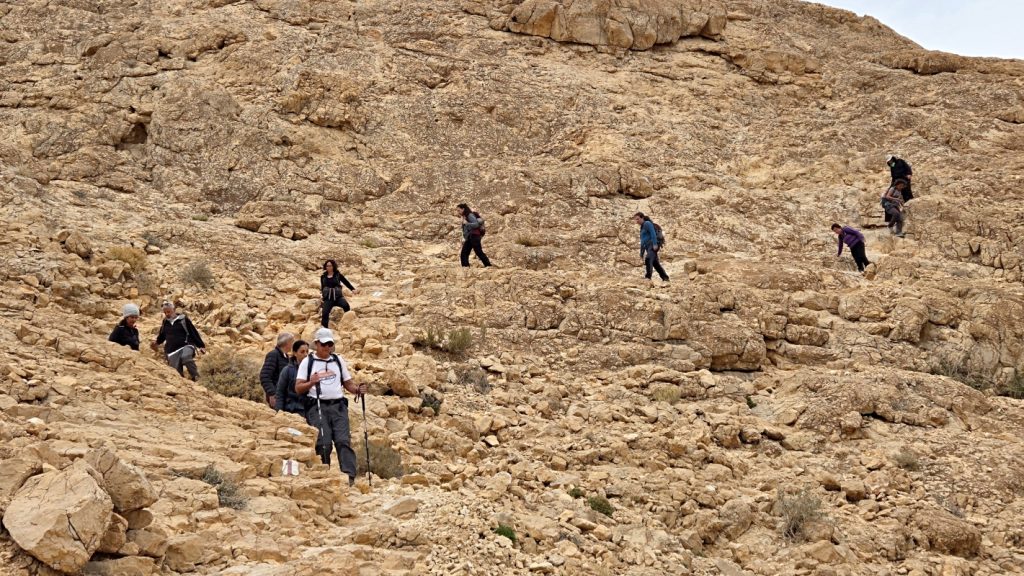 After a comfortable night sleep in a hotel in Mizpeh Ramon, we resumed our hike through Makhtesh Ramon in Nahal G’vanim, a colorful wadi known for its layered, multi-hued sandstone hills.