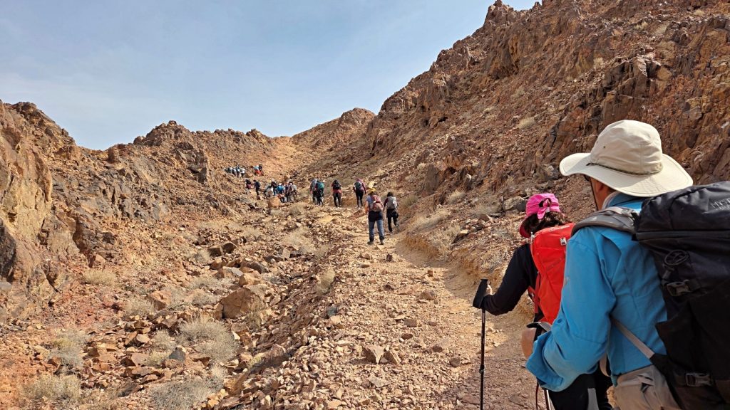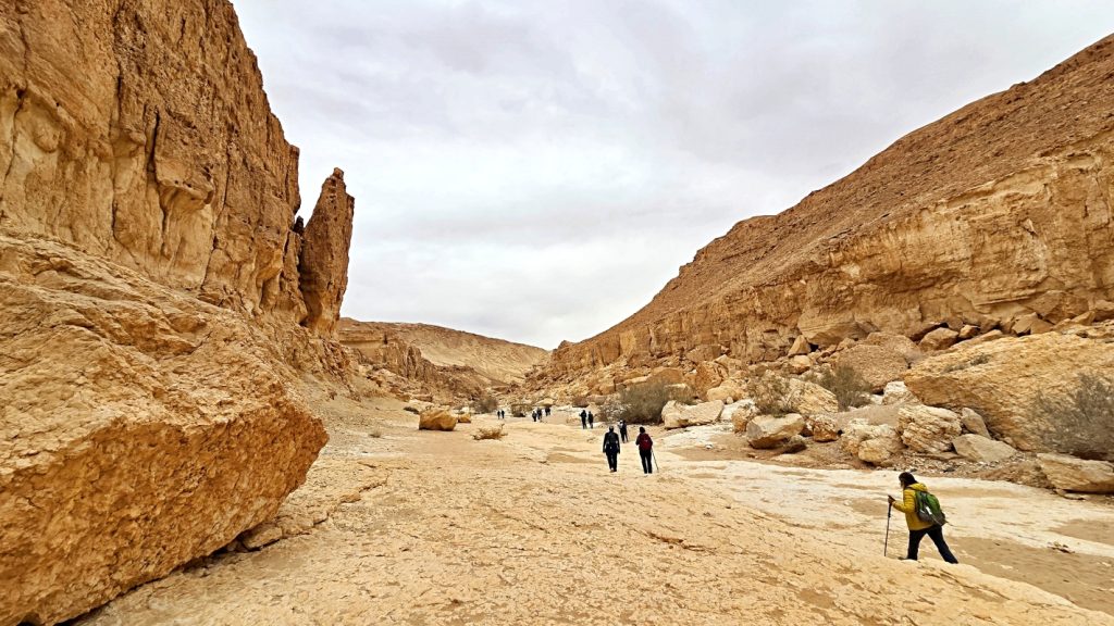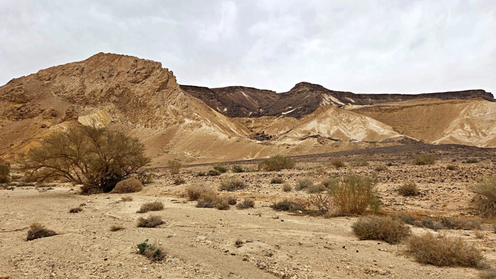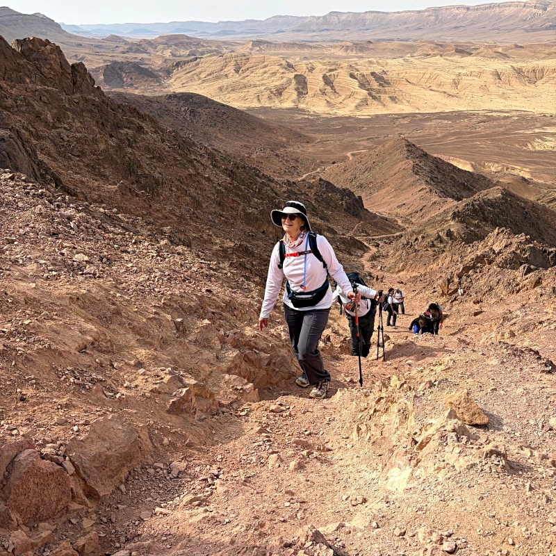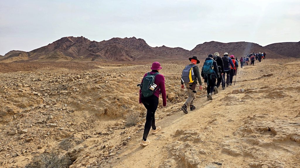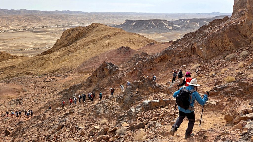 After a comfortable night sleep in a hotel in Mizpeh Ramon, we resumed our hike through Makhtesh Ramon in Nahal G’vanim, a colorful wadi known for its layered, multi-hued sandstone hills.